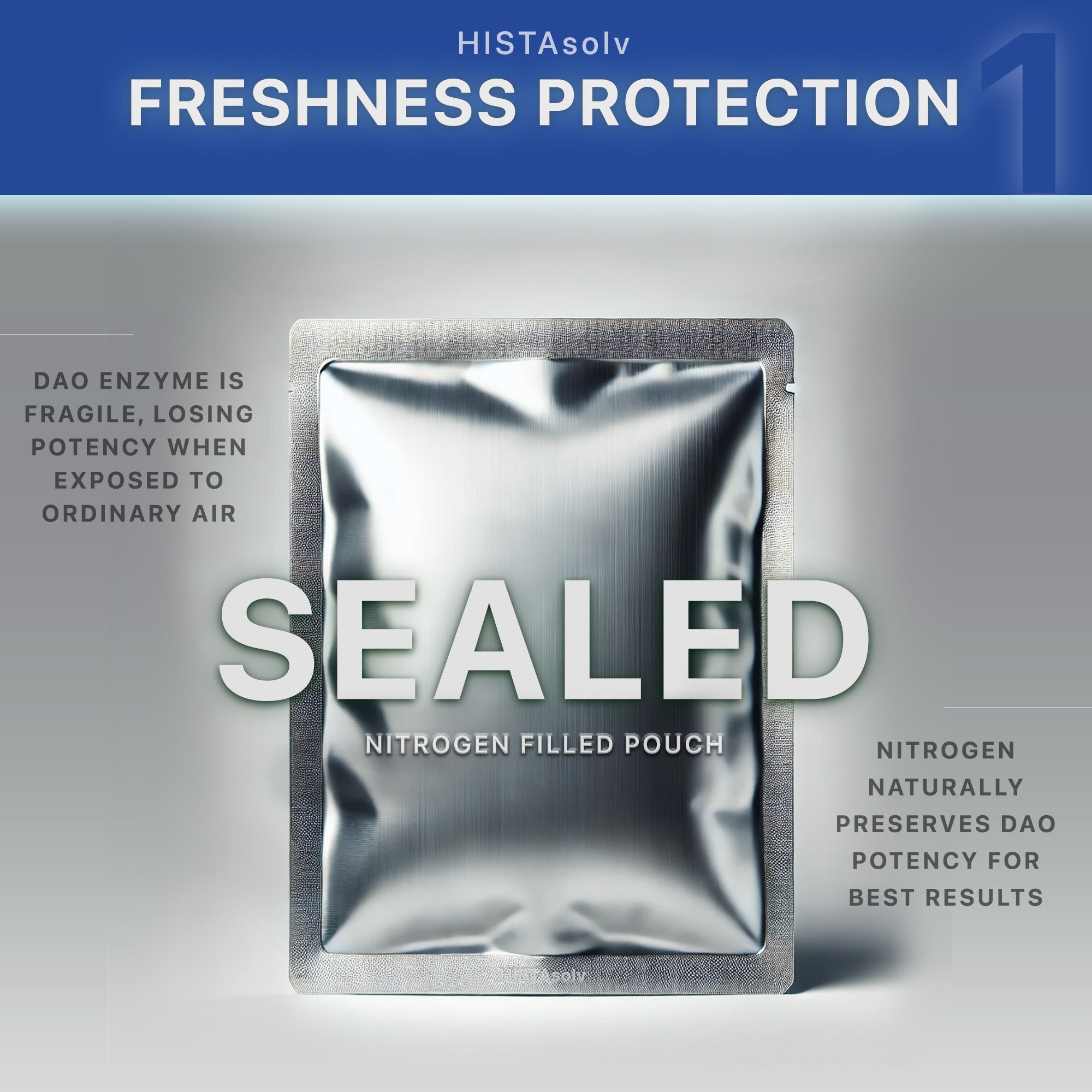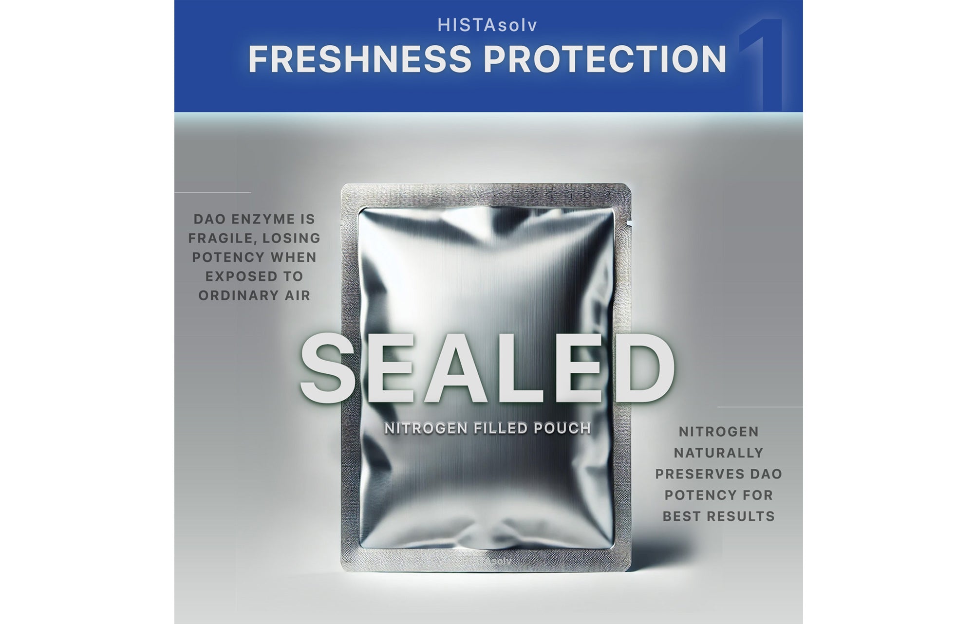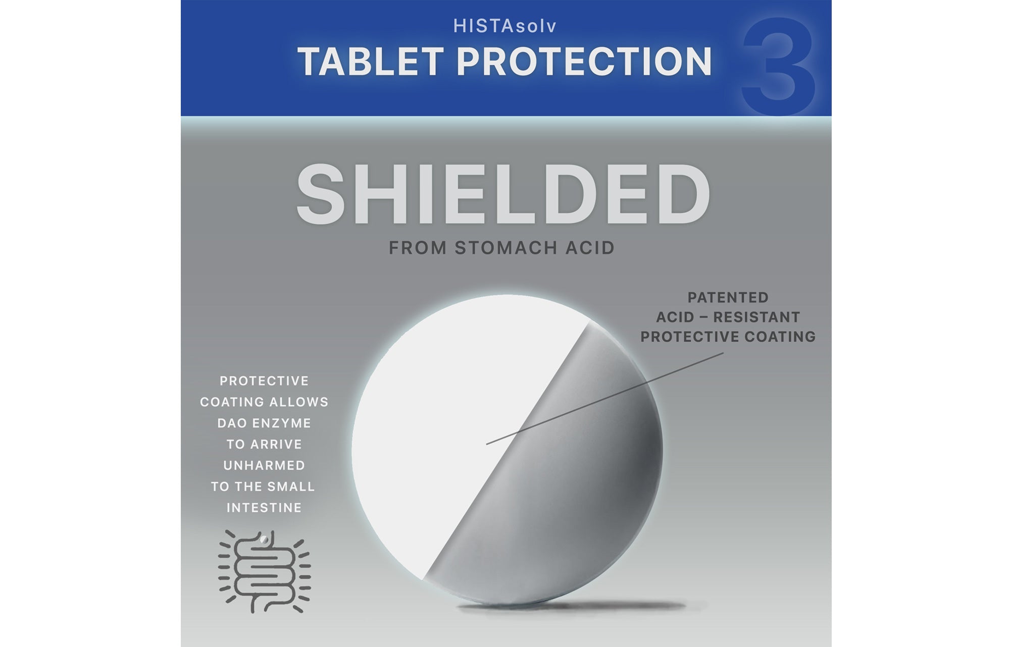 HISTAsolv’s patented protective coating shields our delicate natural DAO enzyme from damaging stomach acid, ensuring you get maximum potency.