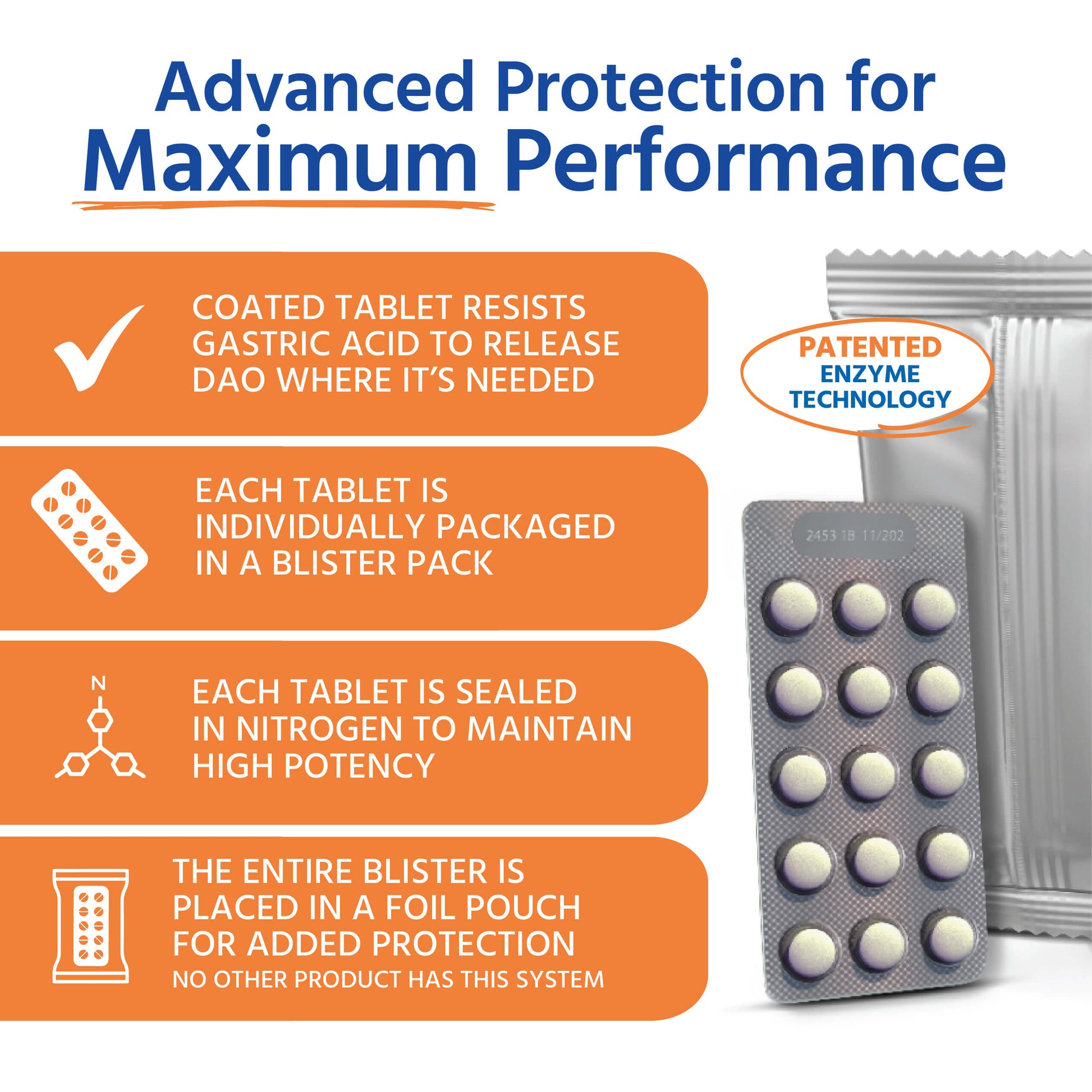 Each HISTAsolv Extra Strength tablet (36,000 HDUs) rapidly increases DAO levels in the small intestine to neutralize food histamine as it arrives. Gluten and Lactose Free.