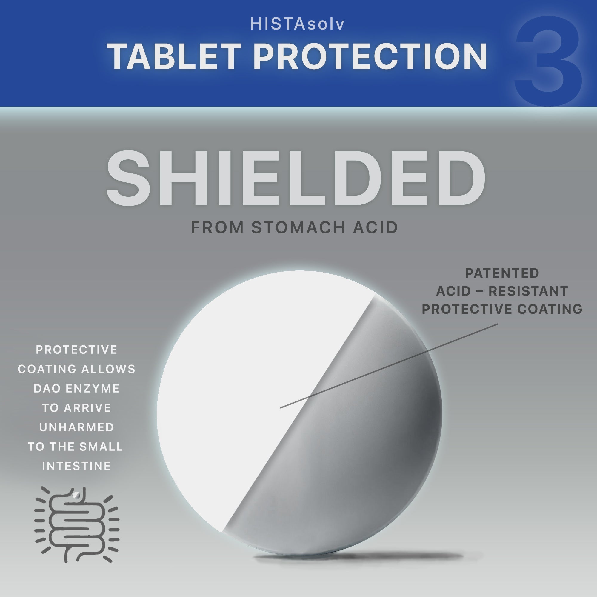 Our enteric-coated tablets ensure HISTAsolv’s high-potency DAO enzyme survives stomach acid and reaches the small intestine, helping your body naturally break down histamine for maximum relief.